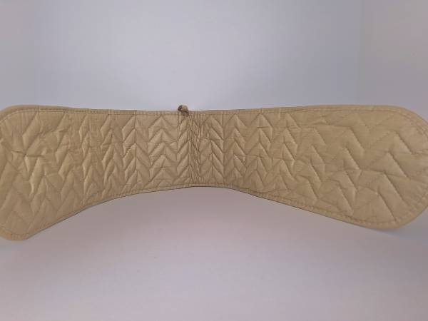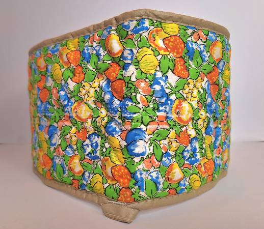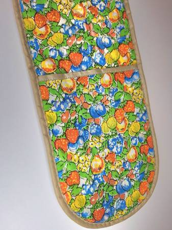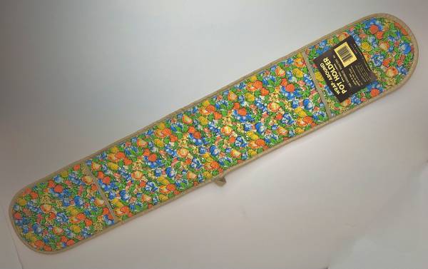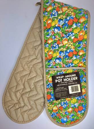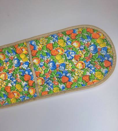 This 1970s vintage wrap around pot holder measures 33" in length. It is designed for baking, roasting, and grilling. The outside features a colorful fruit pattern with shades of orange, blue, yellow, and green, while the inside is a solid beige. Both sides are quilted and have pockets at each end for easy handling and gripping. The coating on the inside is DuPont Teflon for high heat resistance. Washing instructions are hand or machine wash, gentle cycle, tumble dry until damp, then air dry. It is made in the USA.