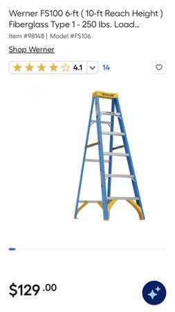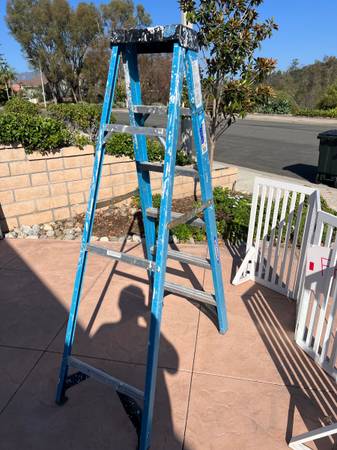 Werner FS106 6 foot folding ladder. Color is blue, legs are of fiberglass with aluminum steps. It was bought brand new eight years ago in Portland, Oregon. It has had some homeowner use and has some paint on it to prove it! It is an excellent mechanical shape. Knew they are running the better part of $150 at Lowe’s or Home Depot. As is, exact cash only you will need something that will handle a 6 foot ladder to transport it. Please do not ask if it is still available. If it is sold, I will delete the post if it is up, it is still available. Daytime only please contact me for a specific appointment.