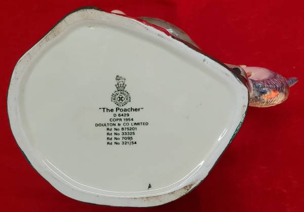 "The Poacher" Character/Toby jug modeled by Max Henk and produced by Royal Doulton of Burslem, England. Model # D6429. Copyright 1954 and produced between 1955-1995. The Poacher character jug was made in three sizes with this being the largest along with small (D6464) and miniature (D6515) sizes. A trout forms the handle.