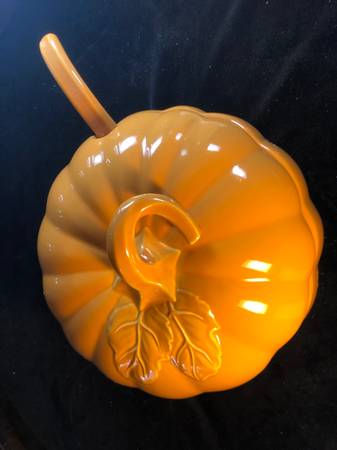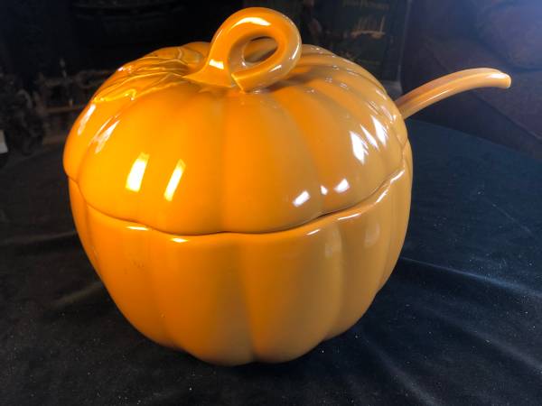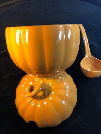 Pfaltzgraff Cider Pumpkin-Shaped Tureen w/ladle and Box Model 478-B60-00 MIB. Ladle measures 13” long, the diameter of pumpkin is 8 1/2” without lid. With lid on measures 9 1/2” tall. From bottom of inside pumpkin to lip is 5 3/4” deep.