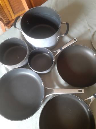 good condition 6 piece set with lids, 3 posts 3 pans