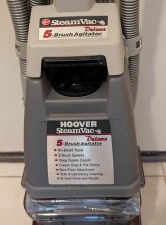 Like New Hoover SteamVac Deluxe Carpet and Hard Floor Deep Cleaner. Only used three times and it did an absolutely wonderful job on an off-white carpet every time. Also cleans marble, tile, stone and laminate hard floors with hot steam and strong scrubber. Very easy to use. User manual is included.
