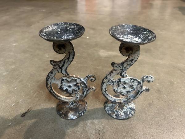 $10 for Pair. The shabby chic boho candle holders are solid and sturdy. Each rustic candle holder measures 6 1/2 inches tall by 4 inches wide. Rustic Farmhouse, weathered style candle stand