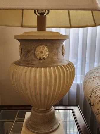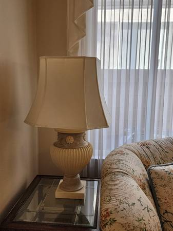 Neutral base with tasteful design. Fabric shade. In excellent condition.