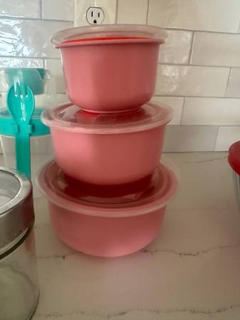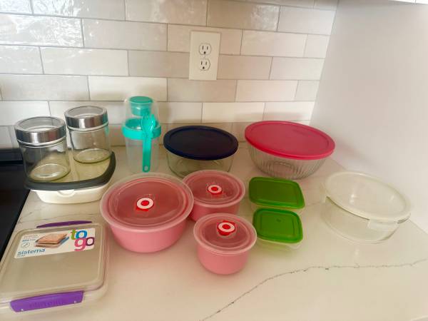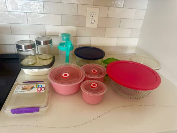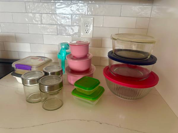 (14) Tupperware containers Large Pyrex glass container with red lid like new Large Pyrex glass container with blue lid Lock & lid glass container great condition 2 ikea green lids small...