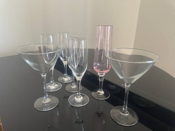 Like new. Moving and need to sell (4) champagne glasses (2) large martini glasses and one extra pink large champagne glass high end All for $10. If interested please text or email. Price is firm