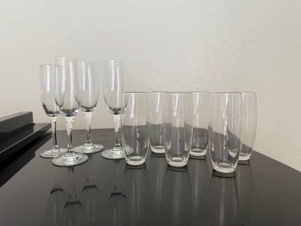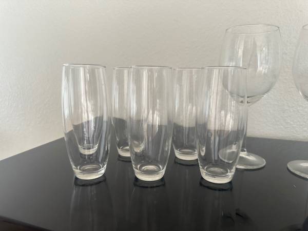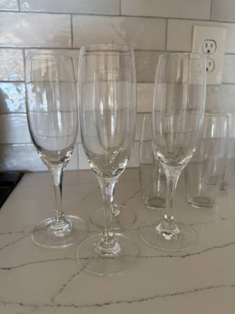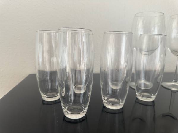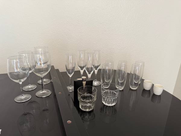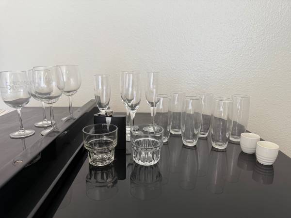 Entire lot for $14 Six stemless champagne glasses. New I never used those 4 champagne flutes Four wine glasses 2 cocktail glasses and two sake glasses If interested please text or email. PRICE FIRM
