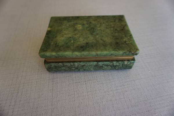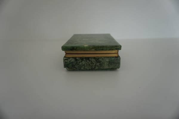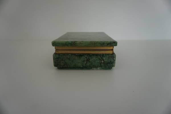 Vintage Italian hand-carved green alabaster jewelry box. It is lidded with a gold-tone metal rim and hinge. Small chip from the bottom left underside corner. Otherwise, it is in excellent condition....