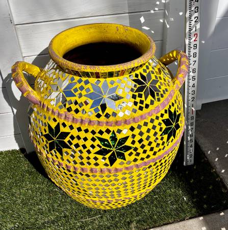 Large Terracotta mirrored pot vase urn yellow green mosaic flower pot vase with handles. This Terra cotta ceramic pot is heavy and sturdy. 26" tall about 22" diameter.