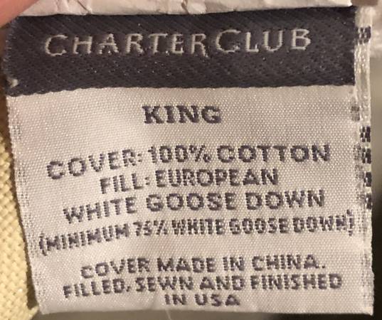Down comforter (blanket / duvet), King size. Charter Club, Level 4 (out of 5) so it is very warm even in winter.