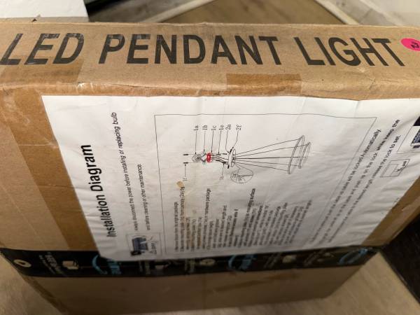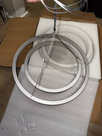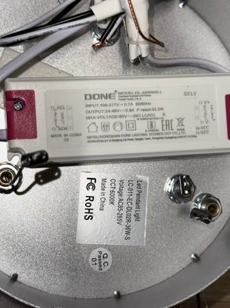 Done Lighting DL50W900L LED pendant light. It consists of 2 concentric silver rings with a central black housing. The light is packaged in styrofoam with wires extending out from the center. The fixture is designed for indoor use and provides ambient lighting.