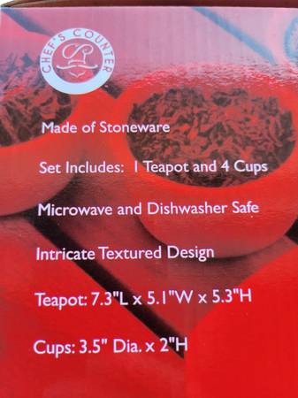 New in box 5 piece tea set Set includes: Tea pot and 4 cups Microwave and dishwasher safe $5.00 cash