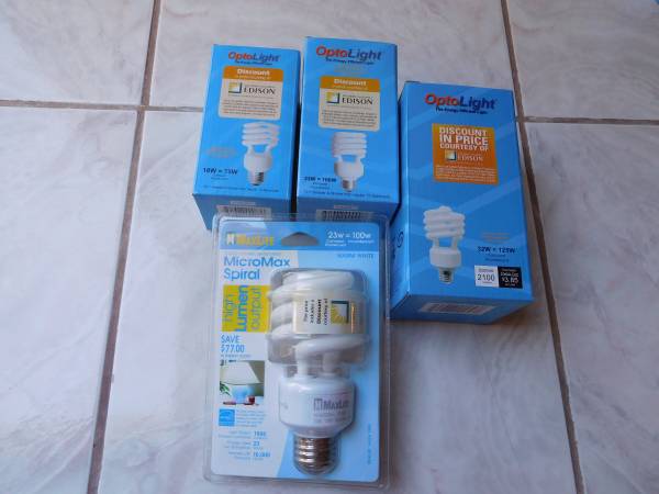 These are new spiral compact fluorescent light bulbs (inputs from 18W, 23W, 32W & 42W) for different power outputs (75W, 100W, 125W&150W) and LED night light -- by OptoLight