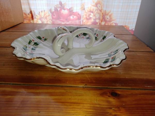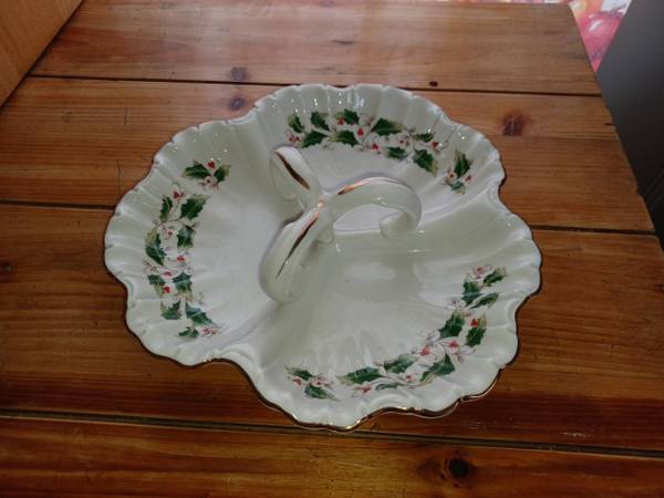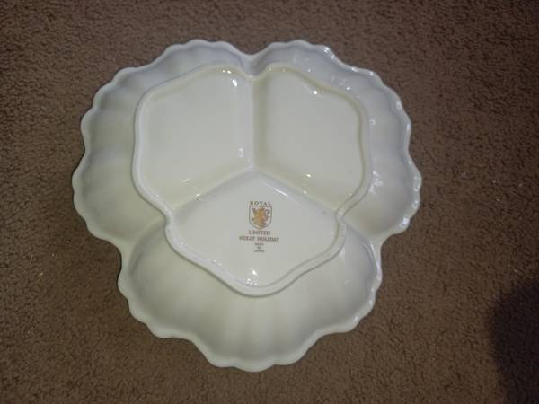 3-section Christmas candy dish with holly decoration and gold trim by Royal Limited Holly Holiday (Approx. 9"w x 8-1/2"l x 1-1/2"h) $25