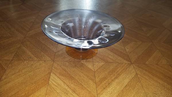 Vintage handmade clear glass bowl by Blenko on platform pedestal. Depending on how the light hits, you can see purple, yellow and grey colors. (Approx. 14"h x 6"d) $90