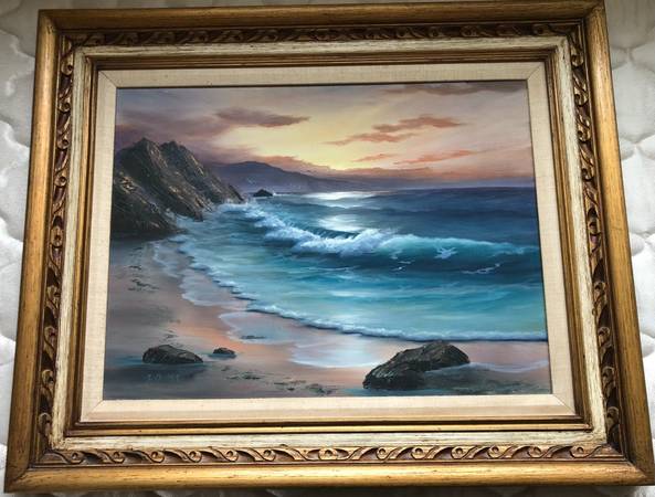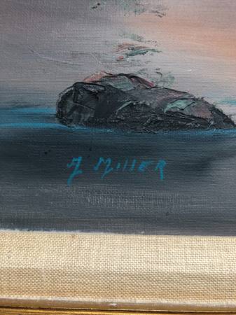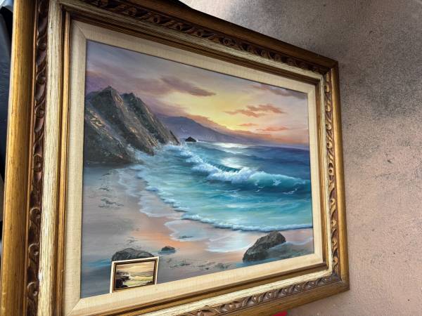 The product is a vintage original seascape painting by California artist Al Miller, framed in a medium size canvas. This contemporary piece, created in Laguna Beach, California, showcases a realistic style of oil painting. Signed by the artist and handmade, this unique painting captures the beauty of the seascape with an original touch that makes it a standout piece of art for any home or collection.