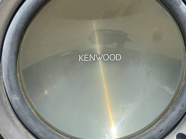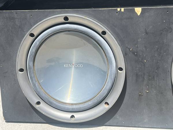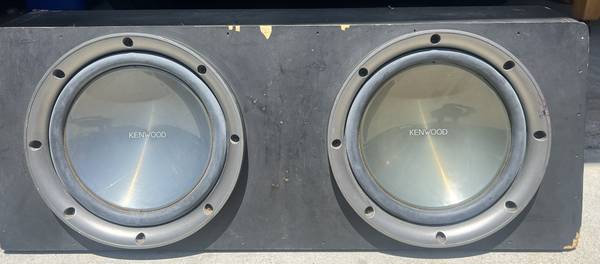 Here is a set of 2 Kenwood speaker subwoofers. These two speakers are mounted inside a plywood box. Great condition. Come get them today!