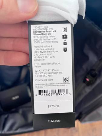 New in box Tumi International Carry On Style: Merge Color: Alloy 22 x 14 x 9 expandable to 11 Cash or Apple pay
