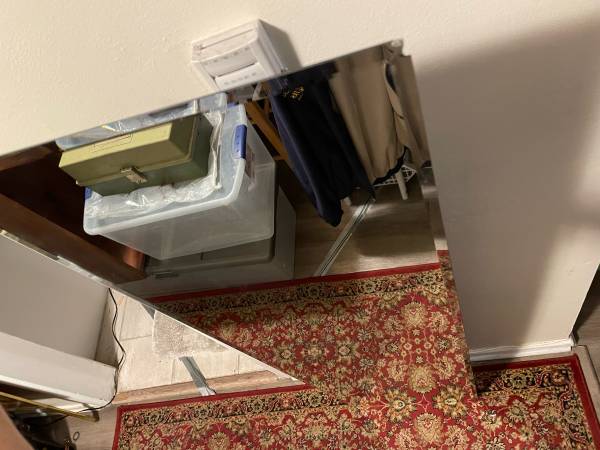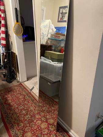 Mirror is in great condition. Measures 16” across and 58” top to bottom. Mirror has a 1/2” beautiful beveled edge on all four sides. NOTE: 3 of 4 corners have chips but they are minor and doesn’t affect the view of the mirror. Mirror is frameless and usually mounts on a wall or bathroom door.