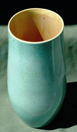 Charles Murphy returned in 1953 to Red Wing Potteries. Murphy introduced designs with the Fleck glazes in 1954 and carved Sgraffito in 1955. The Flecks line used the pastel glaze- Zephyr Pink, Yellow, Light Gray, Nile Blue, Colonial Buff, and Light Celadon -- that encompassed tiny specks of dark brown. Sgraffito pieces were layered with multiple glazes then, before firing, layers were carved away to reveal the glaze color below. Like Belle Kogan's designs, many of Murphy's piece numbers were prefaced with an "M".