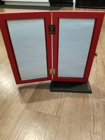 Firm on price. Red Christmas Door picture holder stand. When opened, each door has 24 picture slots. Frame measurements Height is 13 1/4 inches Width while closed is 8 inches Width while open is 15...