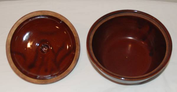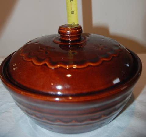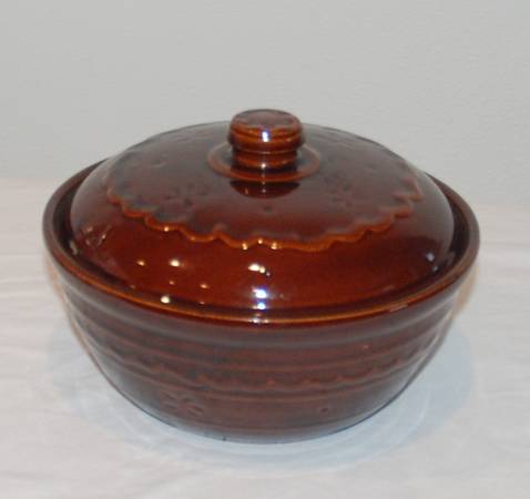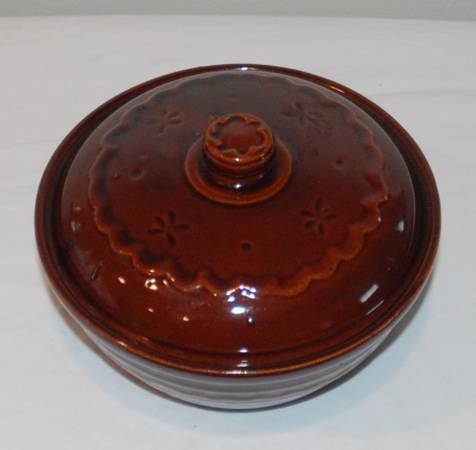 This vintage Marcrest oven proof stoneware covered bowl. The brown color with daisy dot pattern and round shape give it a mid-century modern style. It's a Dutch oven type that comes with a lid.