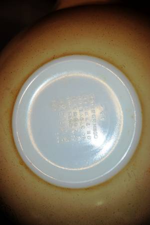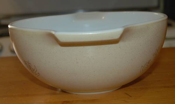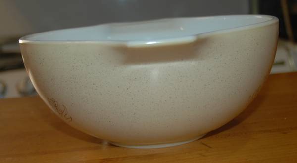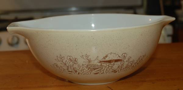 This Cinderella Mixing Bowl is adorned with one of the last Opalware patterns Pyrex produced. Happy mushrooms on a field of speckled tan/brown.