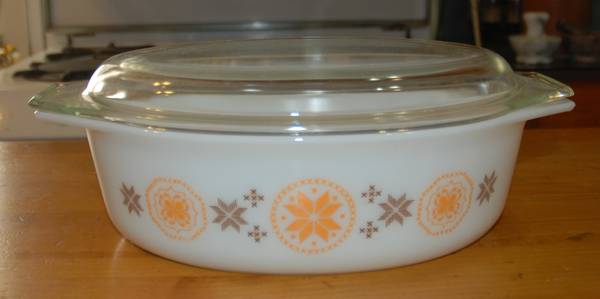 Vintage Pyrex Town and Country 1 1/2 Quart Covered Casserole Dish Vintage Pyrex Town And Country Oval Casserole Dish, Orange And Brown Star on White Pyrex Casserole Dish, Collecting Pyrex