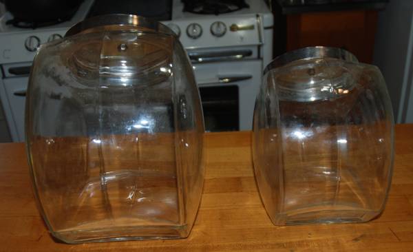 2 VTG Glass Anchor Hocking Tilted Penny Candy COOKIE Jar Chrome Lid - RED Knob