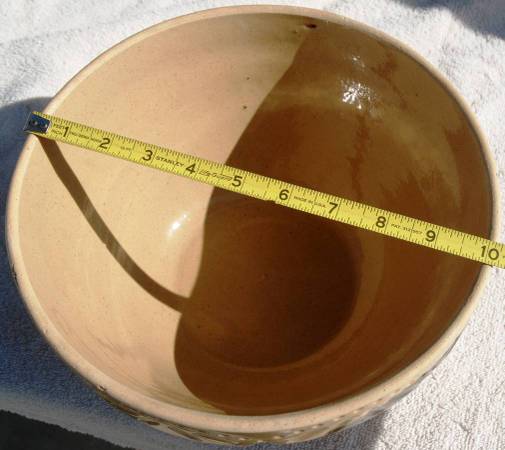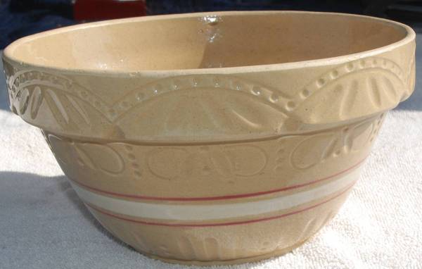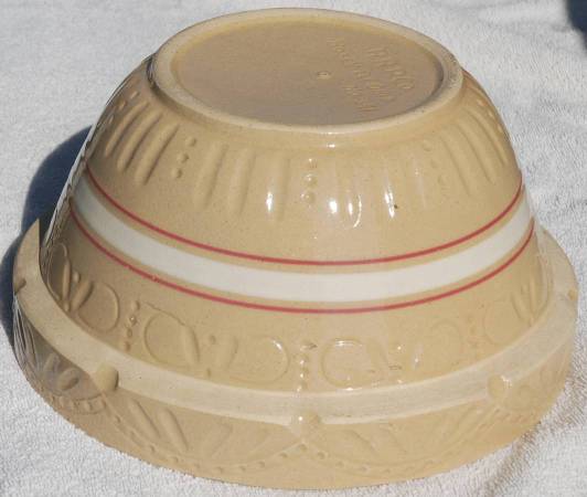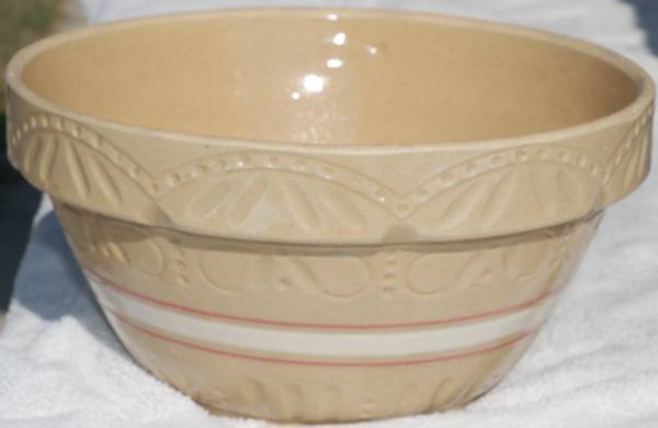 Vintage Robinson Ransbottom 10" yellow ware pink and white bands bowl.