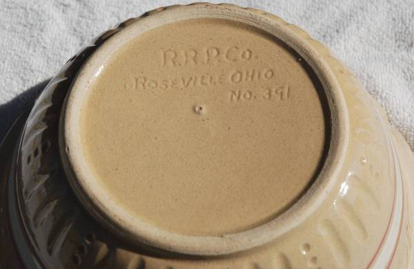 VTG RRP CO ROSEVILLE ROBINSON RANSBOTTOM PINK WHITE BANDS YELLOW WARE BOWL 391