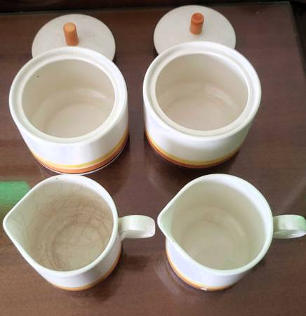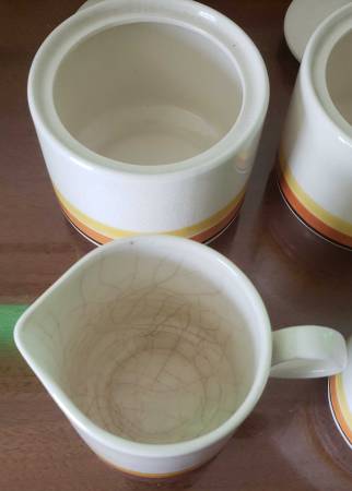 Wear and tear commensurate with age..some crazing on various pieces particularly coffee cups and creamer pitcher.