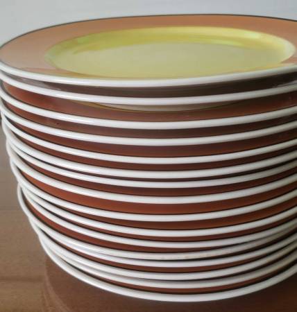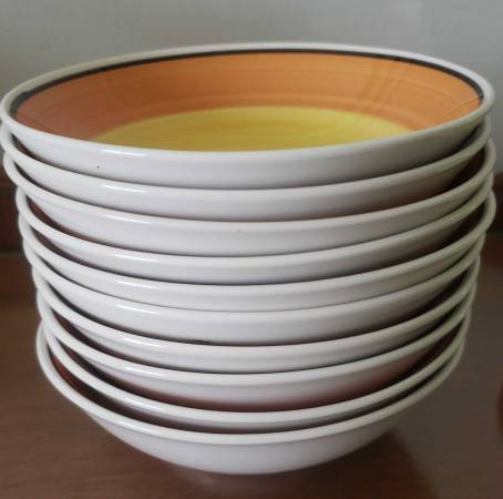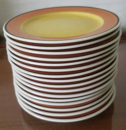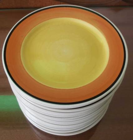 This retro dinnerware is a ray of sunshine with its bold yellow, orange and deep brown stripes. Nasco ceramica Carmel is made in Japan and dishwasher safe. This set includes:
