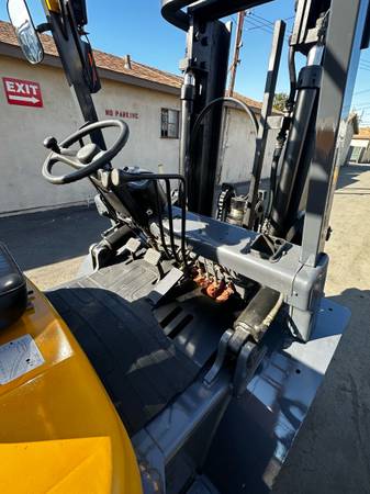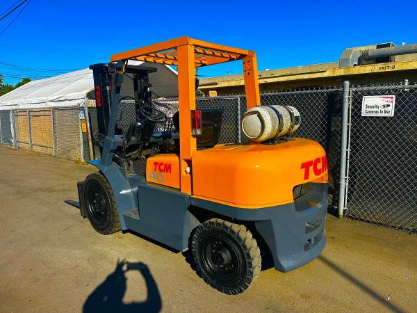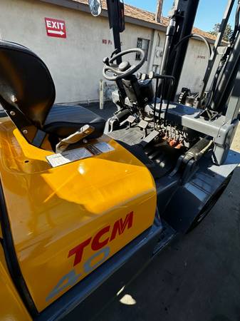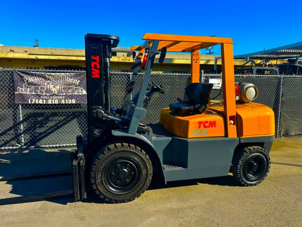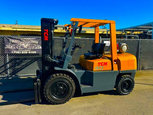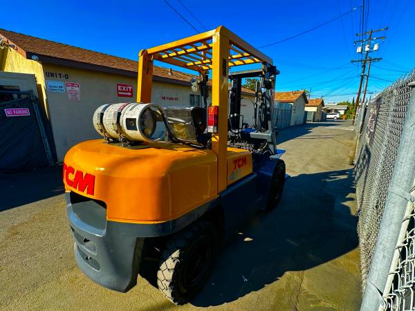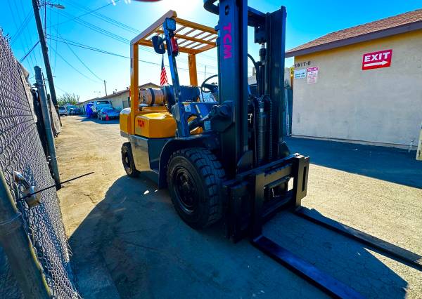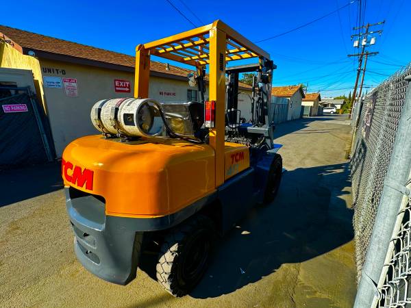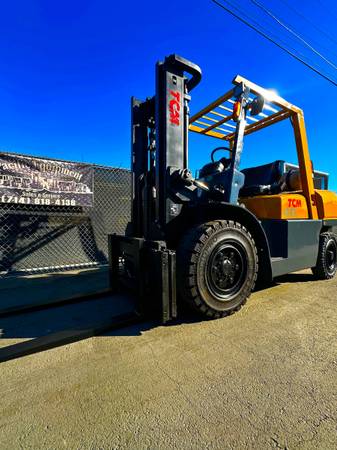 Tcm Nissan forklift 8000 pound capacity with pneumatic tires 5000 hours runs on propane six cylinder Nissan engine new front tires double stage with side shift goes up to 10 feet high delivery available located in Fullerton great for outdoor and indoor work show contact info