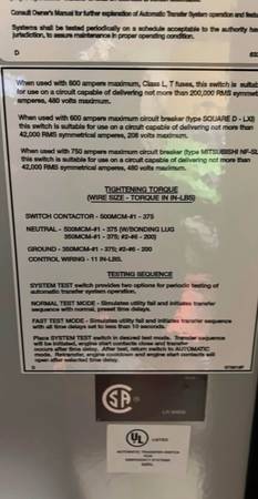 With matching Generac 600 amp Automatic transfer switch which is out door rated but kept indoors. Unit was hooked up and operating properly two months ago. Very nice condition enclosure with stainless hinges. Always on a regular maintenance schedule all filters and fluids are recent.