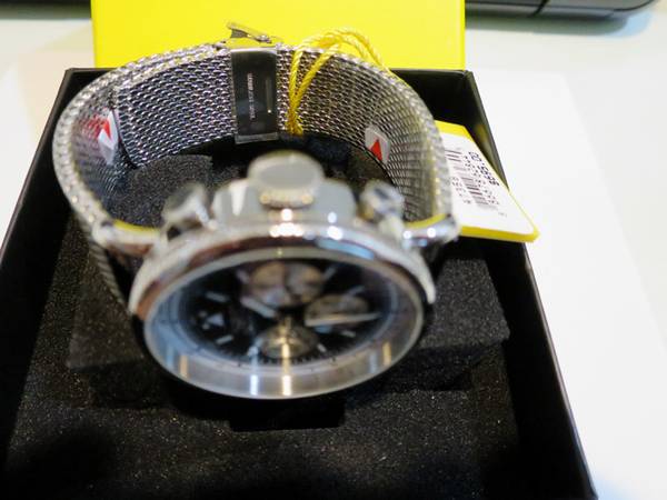 The watch has a Stainless Steel 44mm Case without the crown.. Black and White Dial.. Silver Crown and Pushers.. It is a handsome watch. The watch has a beautifully designed Stainless Steel Mesh Bracelet. The Mesh Bracelet comes with an easy to size clasp so no jeweler is needed to size the watch for the perfect fit. The watch has a great look. See the pictures.. This is a great look for the race track, for the beach, or for a party or just about anywhere.
