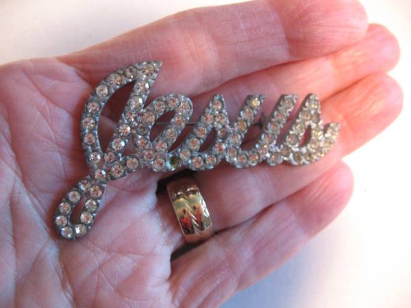 Sparkling Vintage "Jesus" brooch for jacket or hat. Sparkling with clear rhinestones [pink is a reflection of my blouse]. See photos for size. Signed 1989 JMG. Perfect stocking stuffer! $10 Porch...