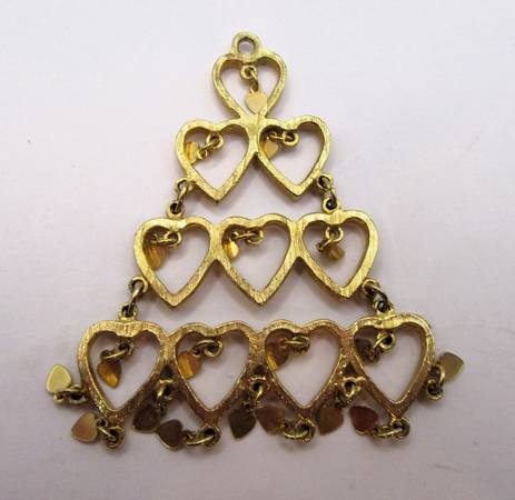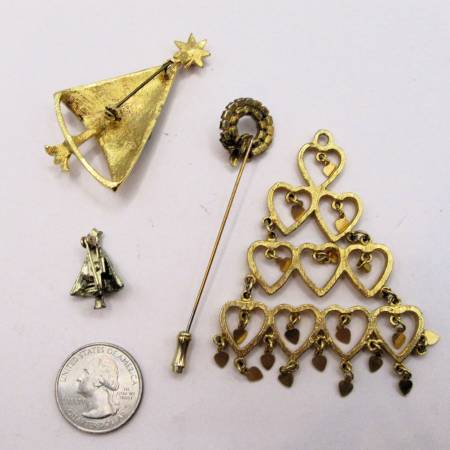 Three Christmas Holiday brooches and one gold tree with hearts (fashion jewelry item). The items shown are the items you will receive. Please examine the photos to confirm item details and to assess the conditions yourself. Feel free to message me if you have any questions or comments or would like to combine multiple orders. Also be sure and check out the other items I have for sale. Price listed is total for all. Thank You.