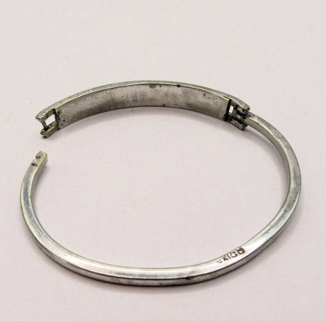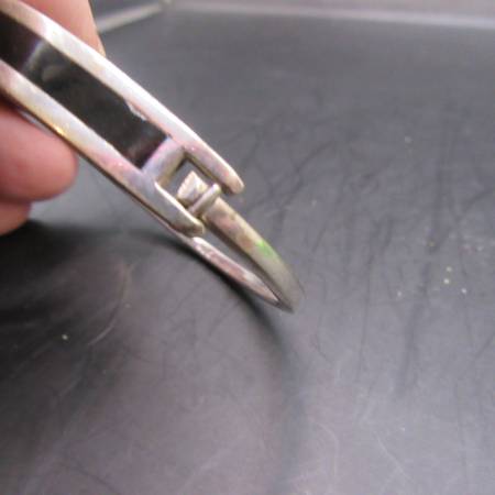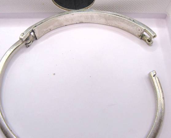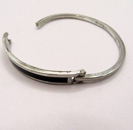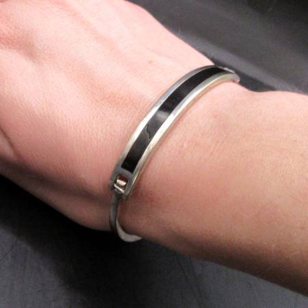 Beautiful, handcrafted sterling silver bracelet with a black Onyx inlay. The bracelet has a sleek, modern design and is a hinged bangle allowing the bracelet to be easily opened and closed for wearing. Marked with "925" indicating 92.5% pure silver, a common standard for Mexican silver jewelry. Please see photos for more details and to assess the condition yourself. Also be sure and check out the other items I have for sale and message me if you want to combine orders. Thank You.