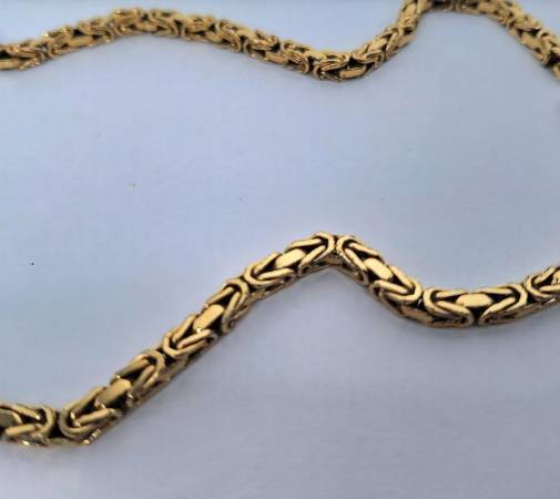 Authenticity Guarantee Lior Jewellery piece in a classic 18" Byzantine chain necklace. Crafted in gleaming 14K yellow gold-filled. This necklace is eye-catching and offers the feel and look of genuine 14 karat gold. This fancy Byzantine link necklace has a lobster claw clasp, making it easy to wear and ensuring its safety.