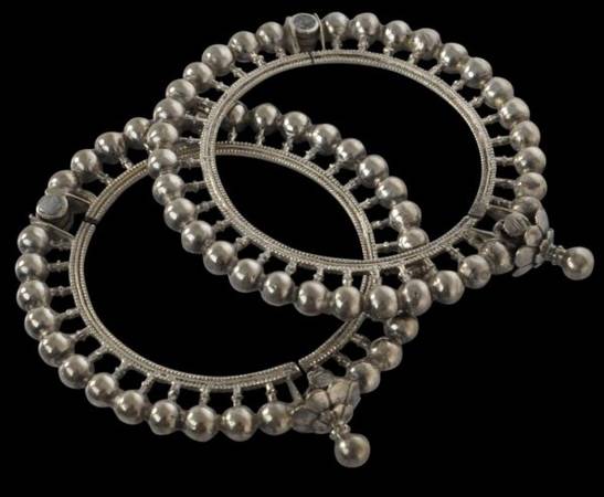 This pair of silver bangles in a star-burst design often were worn in Rajasthan at the end of the wrist to retain myriad other bangles and to hold them in place. Otherwise, they were worn towards the upper arm.