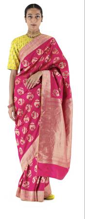 silk brocade sari with rani pink body features a wide gold Zari brocade border and gold zari lotus motifs drawing from archival brocades. The brocade is woven using the elaborate Kadwa technique, where each motif is woven individually utilizing an extra weft insertion, and the reverse of the textile reveals the absence of thread floats.