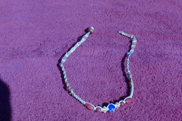 From the 1960' and 70's. Beads are ceramic and wood and woven into the twine chain.