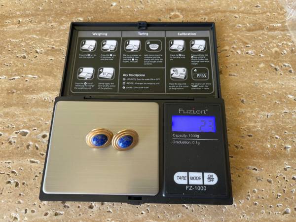 This pair of earrings features an oval cabochon cut lapis lazuli stone set in a 14K gold setting. The posts are marked 14K and they measure about 3/4" by 1/2". The earrings weigh about 2.3 grams....