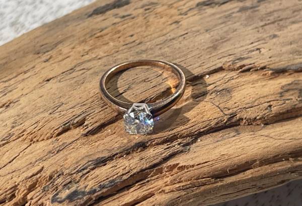 This excellent clarity natural diamond is in a vintage European cut, measuring about 6.15mm and weighing .90 carats. The clarity is VS1 and J in color, set in a 4 prong solid marked 14K rose gold band with matte polish. The ring is a size 5 1/4 and comes with an appraisal with replacement value at $4500. Chance to buy a genuine, natural vintage diamond at an affordable price. Buyer to pay cash and schedule viewing at my bank in Oceanside.
