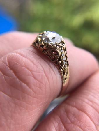 Absolutely stunning, one of a kind, antique rose cut diamond ring! I have been told by a few jewelers she is most definitely over 100 years old. Originally, she was a foil back, but they are so fragile, foil backs can be ruined if they get salt water on them, or even when doing dishes, so we had it changed to an open back and the setting reinforced from underneath so I didn’t have to worry about damaging it. Plus, foil backs look best in candle light, due too the time frame it was made, candle light was how people lit their houses, so now that it’s open back, it’s light play is much better in sun light and indoor lighting. (I have videos of its light play I can send you via text message) Its setting is 8k gold, which was more common back when this ring was made. Although it’s only a half carat diamond, the rose cut, or also known as a fisheye cut, being flat on the back, makes the stone look much larger, and gives it the appearance of being closer to a 1 carat stone. It also is adorned with accent diamonds down the sides. Its delicate filigree design is just so unique and timeless. As much as I love the ring, the relationship it came from has long ended, (the type of relationship I had to pay for my own “surprise engagement” ring 😅🥲) and I just don’t wear it anymore. I personally paid $1,499 for her, from a very reputable antique dealer on eBay, they have many original antique pieces, as well as some recreations, however this was one of the original pieces. The stone is also original to the ring and I have been told it was hand cut! Crazy! Price is NOT firm! Im open to reasonable offers and ready and willing to accommodate. Im very motivated to sell, due too having a new animal family member joining the household who I just put a deposit on, and would like to use this money to cover some of their adoption fee, so send me offers!!! (Just please be respectful and don’t offer me like 1/5th of the asking price) if you have any questions please feel free to contact me. I can take cash or Zelle, possibly PayPal, I’m even open to crypto if it’s one of the main currencies. I’m happy to meet you at a jewelry store so they can test the diamond and gold in front of you, for your peace of mind. If you come See it and need time To think it over, no pressure, I want you to be sure you’re happy and this is the right ring for you! I am also willing to ship the ring, as long as it’s insured for the entire purchase price. I am happy to pay for the shipping if you come close to what I’m asking in your offer. Thank you!!!