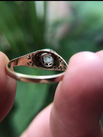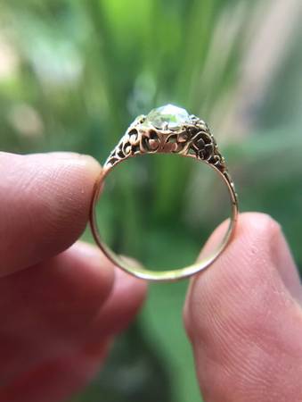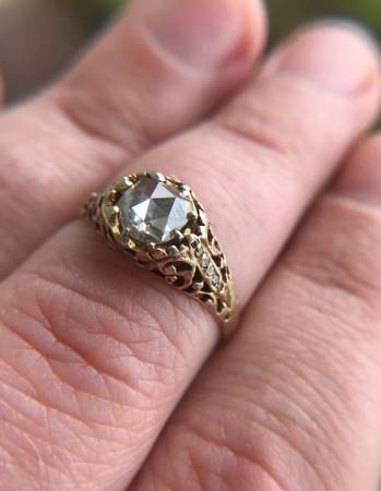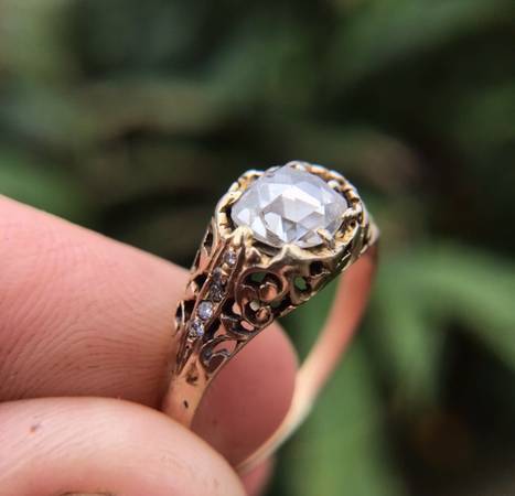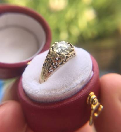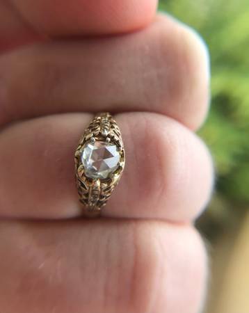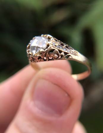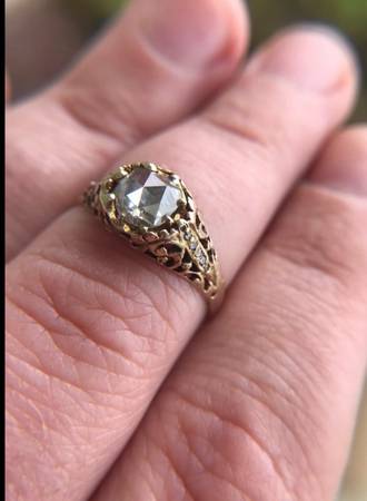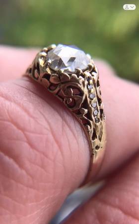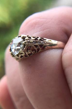 Absolutely stunning, one of a kind, antique rose cut diamond ring! I have been told by a few jewelers she is most definitely over 100 years old. Originally, she was a foil back, but they are so fragile, foil backs can be ruined if they get salt water on them, or even when doing dishes, so we had it changed to an open back and the setting reinforced from underneath so I didn’t have to worry about damaging it. Plus, foil backs look best in candle light, due too the time frame it was made, candle light was how people lit their houses, so now that it’s open back, it’s light play is much better in sun light and indoor lighting. (I have videos of its light play I can send you via text message) Its setting is 8k gold, which was more common back when this ring was made. Although it’s only a half carat diamond, the rose cut, or also known as a fisheye cut, being flat on the back, makes the stone look much larger, and gives it the appearance of being closer to a 1 carat stone. It also is adorned with accent diamonds down the sides. Its delicate filigree design is just so unique and timeless. As much as I love the ring, the relationship it came from has long ended, (the type of relationship I had to pay for my own “surprise engagement” ring 😅🥲) and I just don’t wear it anymore. I personally paid $1,499 for her, from a very reputable antique dealer on eBay, they have many original antique pieces, as well as some recreations, however this was one of the original pieces. The stone is also original to the ring and I have been told it was hand cut! Crazy! Price is NOT firm! Im open to reasonable offers and ready and willing to accommodate. Im very motivated to sell, due too having a new animal family member joining the household who I just put a deposit on, and would like to use this money to cover some of their adoption fee, so send me offers!!! (Just please be respectful and don’t offer me like 1/5th of the asking price) if you have any questions please feel free to contact me. I can take cash or Zelle, possibly PayPal, I’m even open to crypto if it’s one of the main currencies. I’m happy to meet you at a jewelry store so they can test the diamond and gold in front of you, for your peace of mind. If after seeing it you need time to decide, no pressure. I want you to be completely happy and confident this is the right ring for you. I am also willing to ship the ring, as long as it’s insured for the entire purchase price. I am happy to pay for the shipping if you come close to what I’m asking in your offer. Thank you!!!