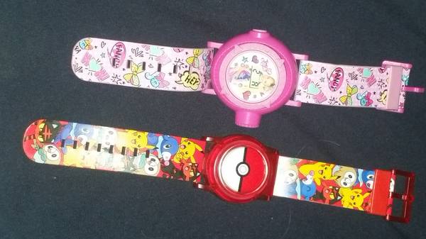 Here are two cool watches, a Pokemon watch and a Jojo watch. The JoJo watch has a projector built in and it projects 20 cool scenes! Works great ! Pokemon needs a battery. Trade or sell!