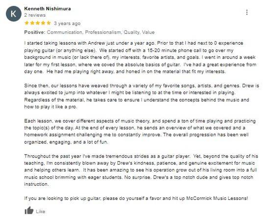 Hi! My name is Andrew McCormick, owner of McCormick Music Lessons in Costa Mesa — the highest-rated music school in the area with hundreds of happy students.