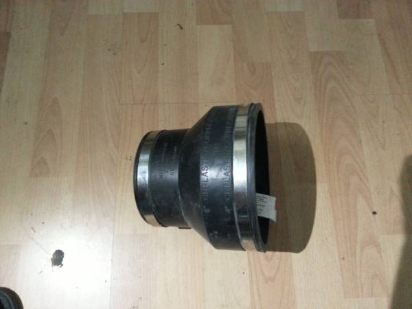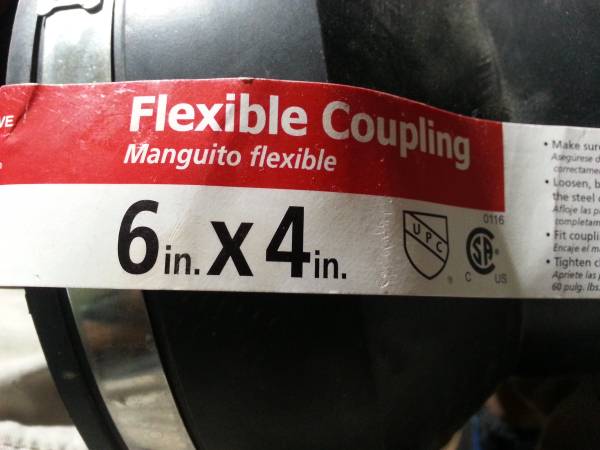 Rubber with steel clamps. Connects Cast Iron, Plastic Copper, or Steel Pipes